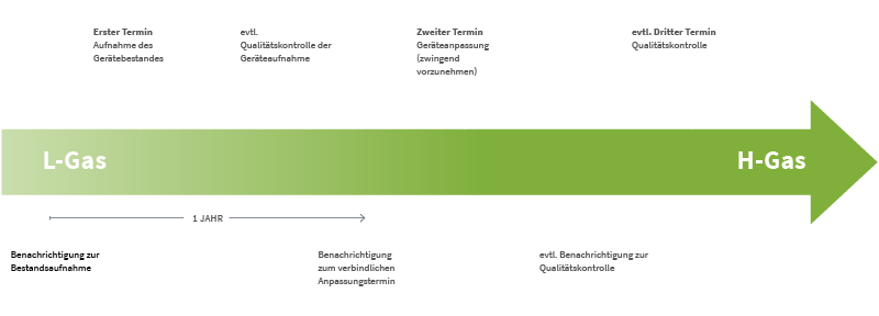 In einigen Gebieten Deutschlands wird die Gasart von L-Gas (low calorific gas) auf H-Gas (high calorific gas) umgestellt. Dies gilt gleichermaßen für Haushalts-, Gewerbe- und Industriekunden. Die Umstellung findet hauptsächlich im Nordwesten Deutschlands statt. Die mit L-Gas versorgten Gebiete reichen bis nach Südniedersachsen, in die Region Rhein-Ruhr und bis nach Südhessen. Dabei werden zunächst alle gasbetriebenen Geräte überprüft.