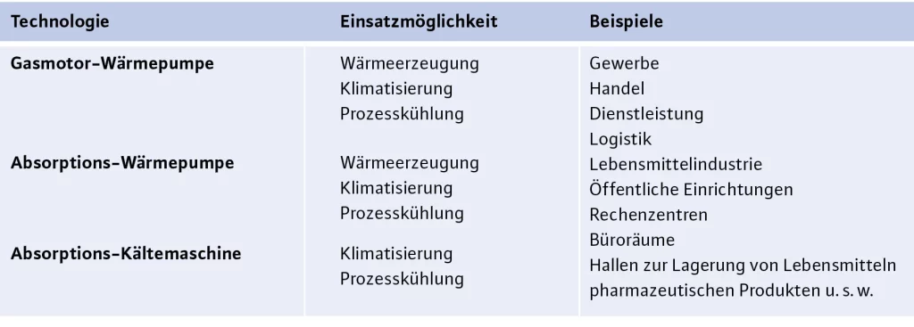 Kühlung ist ebenso wie Klimatisierung für zahlreiche Branchen ein wichtiges Element der betrieblichen Abläufe. In Fleischereien ist eine ausreichende Kühlung der Waren unabdingbar. Die Klimatisierung von Patienten- und Pflegezimmern gehört in Krankenhäusern oder Heimen genauso zum Standard wie das Temperieren von Gästezimmern in Hotels oder von Büroräumen. Mit Gaswärmepumpen lassen sich die vielfältigen Anforderungen an das Heizen und Klimatisieren von betrieblich genutzten Räumen und Anlagen besonders effizient erfüllen.