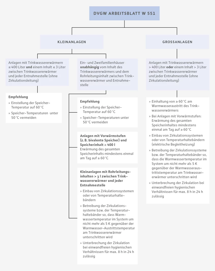 Das Arbeitsblatt W 551 des Deutschen Vereins des Gas- und Wasserfaches (DVGW) stellt folgende hygienische Anforderungen an die Verteilung von Warmwasser:
