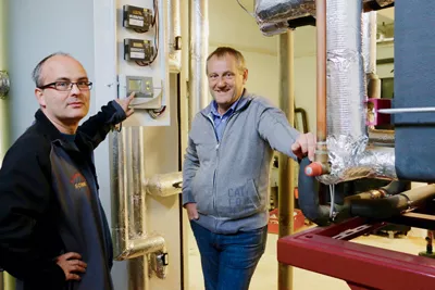 Steffen Papendorf, Geschäftsführer Neumarkt-Fleischerei, und Sandro Schmidt, Planungsbüro Zwo S., in der Kühlanlage mit Wärmerückgewinnung (Quelle: EMB Energie Mark Brandenburg GmbH)