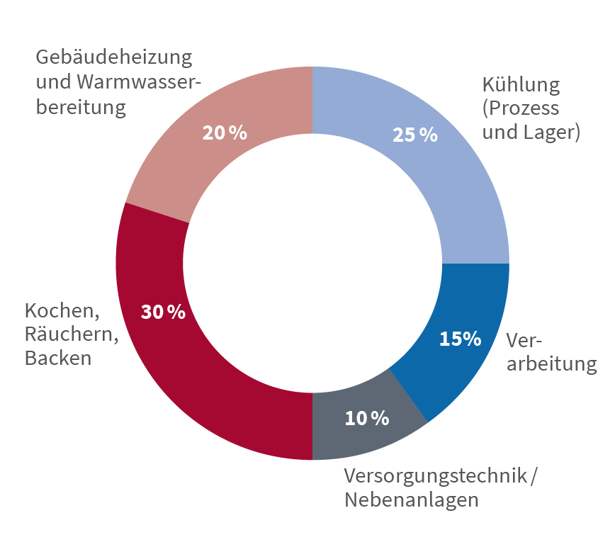 Betrachtet man den Gesamtenergiebedarf, zeigt sich, dass neben Garprozessen, Heizen und Warmwasserbereitung die Kühlung mit rund einem Viertel einen nennenswerten Teil am Gesamtenergieverbrauch ausmacht. Die verbleibenden 25 Prozent entfallen auf Verarbeitungsprozesse und Versorgungstechnik.
