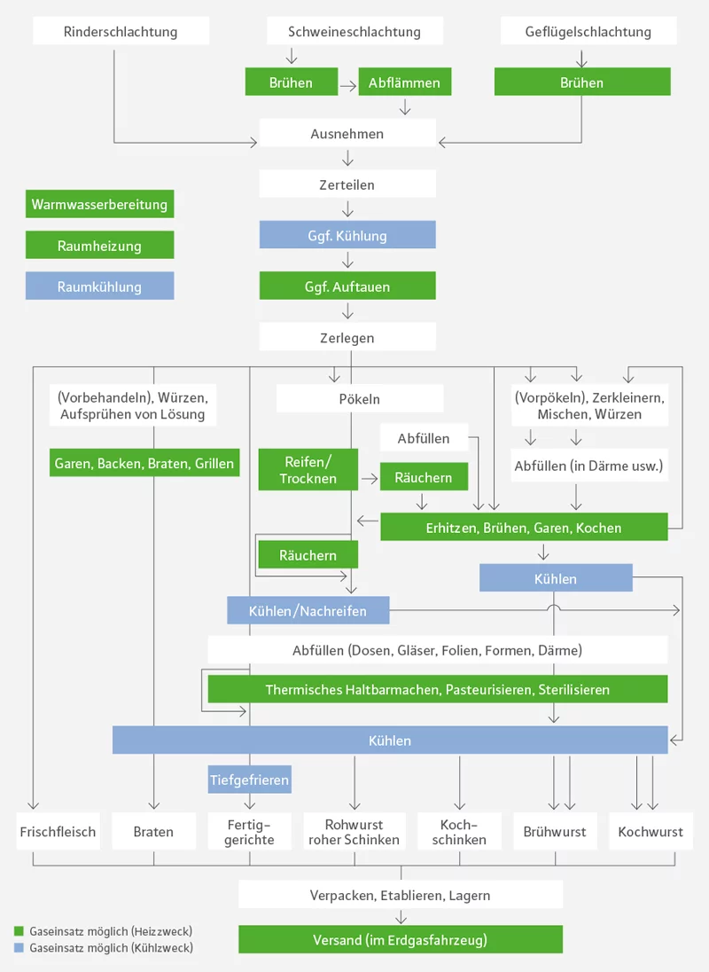 Gas spielt bei der Fleischerzeugung bzw. der Fleisch- und Wurstverarbeitung eine wichtige Rolle: als Energie zum Brühen und Flämmen bei der Schlachtung sowie zum Garen, Braten, Kochen, Grillen und Backen zum Beispiel in Brat- und Backanlagen oder im Kochkessel.