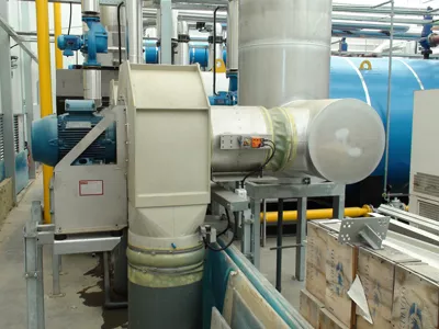 Die Abgase (mit ca. 10 Prozent CO2) werden vor dem Schornstein durch ein zusätzliches Dosiergebläse abgesogen und mit Frischluft vermischt in die Gewächshäuser geblasen. Dazu sind Rohrverteilungssysteme (häufig PVC-Kanalrohre mit Löchern als Ausblasöffnungen versehen) installiert. Entsprechend kann eine gleichmäßige Verteilung für die gesamte Gewächshausanlage über ein CO2-Messgerät gesteuert erfolgen oder jedes Haus kann einzeln mit separater Messeinrichtung über Motorklappen geregelt werden.