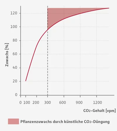 Diese schematische Wachstumskurve zeigt deutlich, wie CO2-Mangel unter 400 vpm den Pflanzenzuwachs reduziert. Die Zuwachssteigerung über 1.000 vpm flacht dann jedoch ab. Da ein Absinken des CO2-Gehaltes zu erheblichen Wachstumseinbußen führen kann, bedienen sich die Gärtner heute verschiedener Methoden der zusätzlichen CO2-Anreicherung der Gewächshausluft.