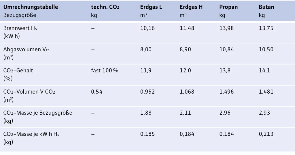 Für die Umrechnung der CO2-Mengen von kg in m3 Erdgas bzw. kg Flüssiggas hat sich folgende Zusammenstellung als hilfreich erwiesen: