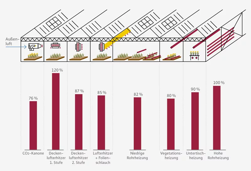 Die sogenannte hohe Rohrheizung war das übliche Heizungssystem bis Anfang der 70er Jahre. Viele Berechnungen und Zahlenangaben im Gartenbau basieren deshalb noch heute in der Regel auf diesem Heizungssystem (hier gewähltes Referenzsystem 100 Prozent).