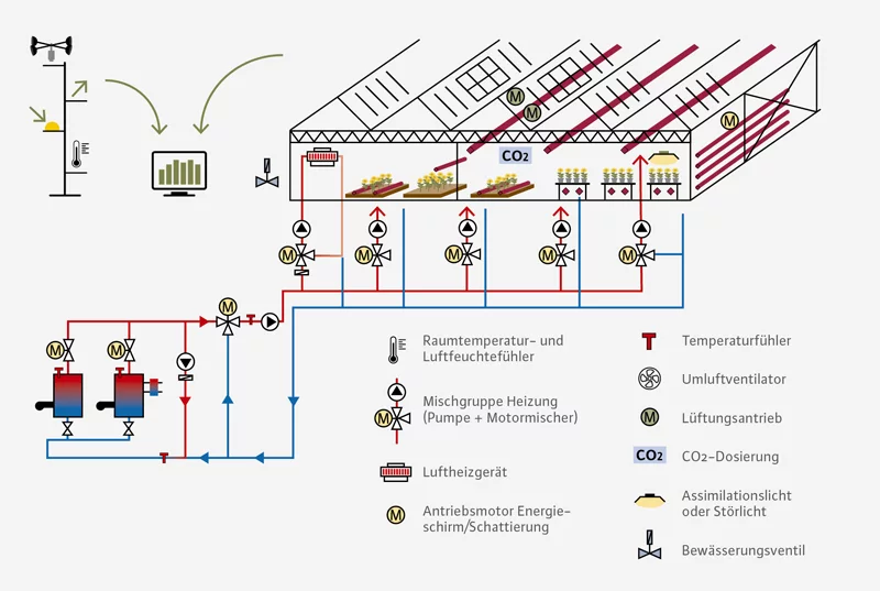 Eine Gewächshausregelung umfasst sehr viele pflanzenbaulich wichtige Stellorgane wie Pumpen, Mischer, Lüftungsantriebe, Schirmantriebe usw., die nur von speziellen Klimaregelcomputern gesteuert werden können. Standardregeltechnik ist dazu nicht anzuraten, weil die speziellen Gewächshausbedingungen besondere Regeloptimierungen erfordern. Für Planung, Installation und Wartung (Betrieb) sollte eine Firma mit entsprechenden Spezialkenntnissen beauftragt werden.