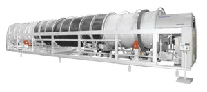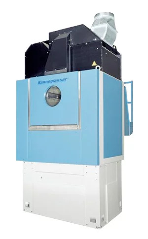 In diesen Maschinen erfolgen die Waschprozesse des Waschens und Spülens in unterschiedlichen Kammern, aber gleichzeitig. Durch die Wasserführung zwischen den unterschiedlichen Kammern wird Wasser und Energie gespart. Die Bearbeitungszeit für das Waschen und Vorentwässern (bis ca. 50 % Restfeuchte) beträgt ca. 30 Minuten. Erdgas kann zur direkten Beheizung (erst wenige Maschinen im Einsatz) oder über den Wärmeträger Dampf zur indirekten Beheizung genutzt werden.